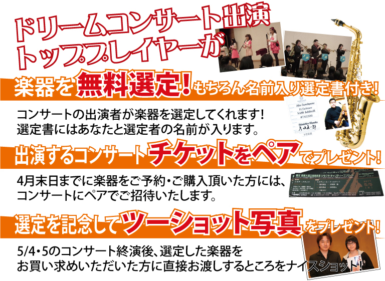 ドリームコンサート出演者による楽器の選定・販売を行っています!4月末日までに楽器をご予約・ご購入頂いた方には特典が!!